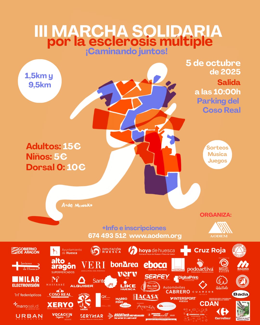 * Los dorsales podrán retirarse en la sede de la Asociación Oscense de Esclerosis Múltiple el jueves 2 y viernes 3 de octubre de 9.00h- 13:00h a 16:00h- 20.00h y el mismo día de la prueba hasta 30 minutos antes de la salida (desde las 9:00h hasta las 9:30h).